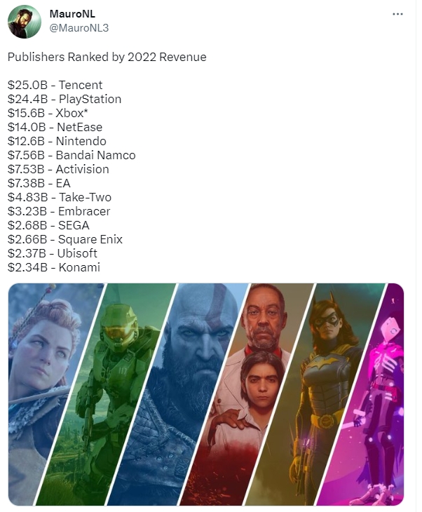 直播吧3月26日讯 近日国外游戏行业分析师MauroNL3盘点了2022年全球游戏厂商的营收表现,腾讯以250亿美元的收入在全球游戏发行商中位列第一,PlayStation 244亿美元的营收排在第二,Xbox 156亿美元的营收为估算,而御三家中间还插入了另一个中国游戏厂商网易(140亿美元),任天堂则为以126亿美元的营收位列第五。