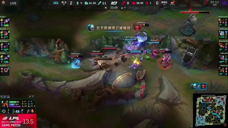 直播吧4月3日讯 在2023LPL春季赛季后赛BLG对阵WBG的第三局比赛进行到22分钟,Elk厄斐琉斯先AOE打残两个,背靠石头人先A再给清辉夜凝烟花绚烂拿下四杀!LPL官推分享英文流解说这波Elk厄斐琉斯四杀的视频。