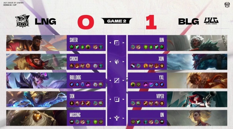 后期龙魂团Missing巴德空大被秒,Bin安蓓萨进场游龙,BLG团灭LNG并同时拿下电龙魂与大龙,经济领先7k,随后BLG轻松冲上LNG高地,一波推平LNG基地拿到比赛胜利。