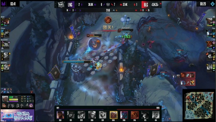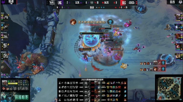 【22:48】BLG入侵LNG野区再次逮捕Missing巴德,BLG经济领先2k。