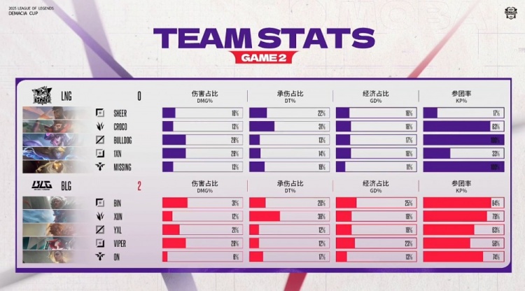 第二局前期,ON芮尔上路排眼被控送出一血,Viper女枪随后阵亡,LNG率先拿到人头优势。
