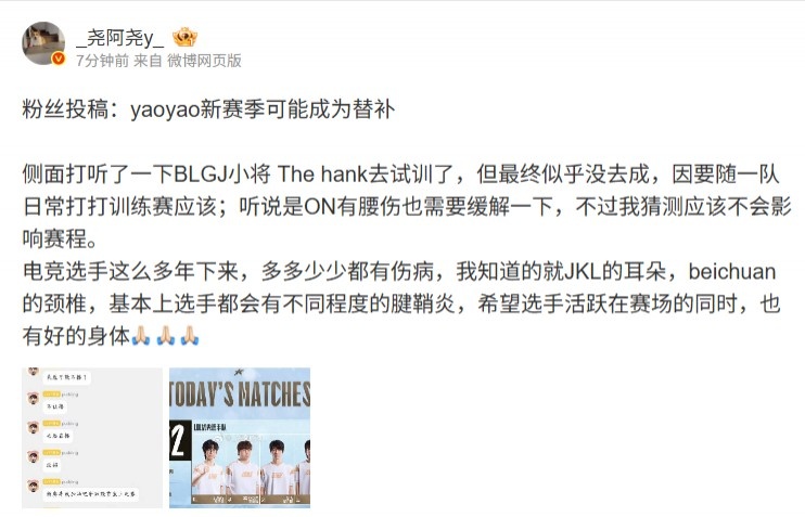 侧面打听了一下BLGJ小将The hank去试训了,但最终似乎没去成,因要随一队日常打打训练赛应该;听说是ON有腰伤也需要缓解一下,不过我猜测应该不会影响赛程。