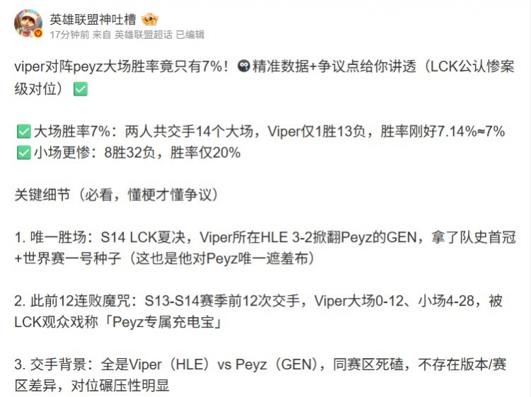 2. 此前12连败魔咒:S13-S14赛季前12次交手,Viper大场0-12、小场4-28,被LCK观众戏称「Peyz专属充电宝」
