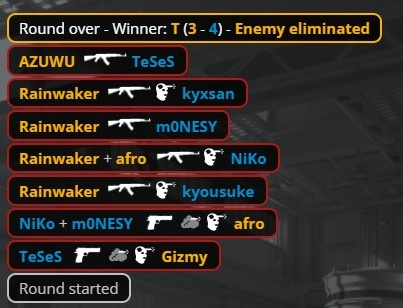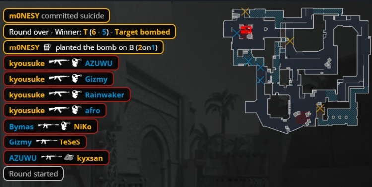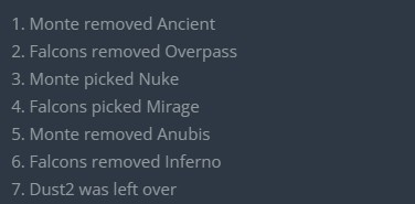 第5回合Monesy一把AK铁板双杀,Monte继续转B这次终于得手,afro下包后大狙双杀为Monte拿到首分。随后Monte外场双火烤大虾击杀Niko,Rainwaker进场打掉龙哥后,京介与Monesy出外场找人被杀送分。Falcons第7回合纯E,Rainwaker单门前特四杀,Monte拿到第3分。