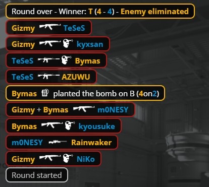 第4回合Monte四人Eco,Bymas英雄M4,Niko单人摸A二楼被杀,Falcons四人中路转B惨遭团灭,Falcons次回合存钱送Monte第3分,AZUWU拱门特四杀。