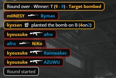 暂停回来,京介下楼背身躲两颗闪光后双杀Rainwaker与Bymas,次回合京介进铁板双杀再来B点完成三杀,Falcons将比分扳为9-9平。