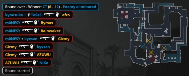 第11回合K3上K1打掉外场击杀Niko的Gizmy,K3再回内场换掉AZUWU,龙哥与Monesy回防A点双杀收割拿到第6分。半场结束前Monte枪械不全,Gizmy沙鹰外场双杀Monesy与K3,捡到大狙后进B轰掉龙哥,afro沙鹰打掉Niko,双方6-6战平。