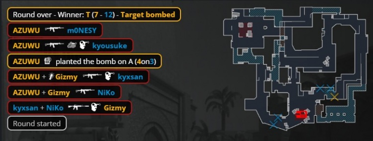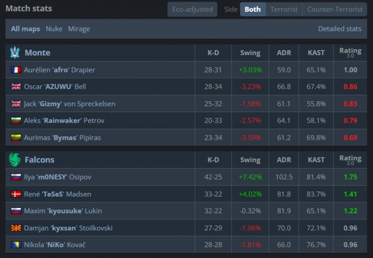 第19回合,AZUWU黄房门口混烟三杀,Monesy难保大狙换掉AZUWU让出第10分。次回合京介冲进黄房双杀破点,Monesy对位大狙轰掉afro,双方10-10战平。Monte随后存钱让出第11分,但Monesy外场进攻大狙轰掉Gizmy,拿到人数优势的Falcons轻松拿到赛点。最终京介开场大仓打掉AZUWU,Falcons三人进A下包得手,Niko架住管道与龙哥双杀收割,Falcons13-10拿下图一。