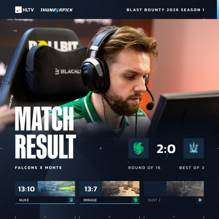 直播吧1月18日讯 CS2大赛BLAST赏金赛S3来到第二轮,Falcons两图横扫在第一轮战胜NAVI的Monte!