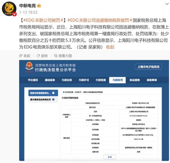 公开信息显示,上海阳川电子科技有限公司为EDG电竞俱乐部关联公司。