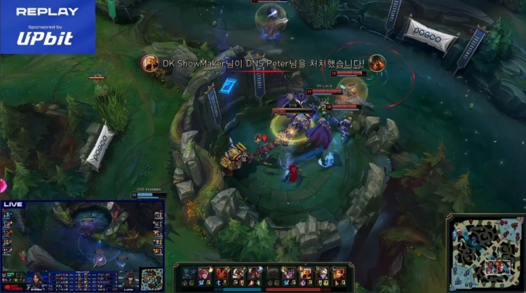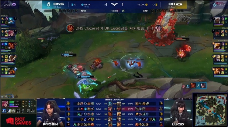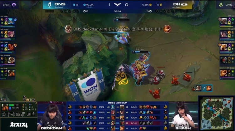 第一局前期下路2v2,Smash与Career惨遭DNS线杀0换2。随后Clozer岩雀上路抬回Lucid赵信,DNS四人越掉Siwoo安蓓萨,DNS经济领先1.6k。紧接着野区团战,ShowMaker沙皇配合Smash与Career反打,DK打出1换4,双方经济持平。