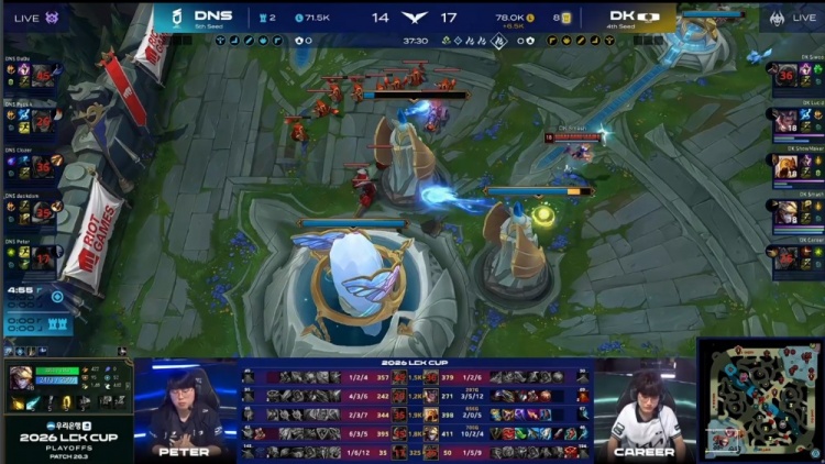 后期龙魂团,Clozer岩雀击杀Career女坦,DK正面四打五,Siwoo安蓓萨游龙1v3,Smash伊泽瑞尔收割并拿到双杀,DK打出1换5团灭DNS。随后DK拿到大龙与风龙魂,经济领先4k。老龙团Smash四杀收尾,DK打出2换5团灭DNS,一波推平DNS基地先下一城。