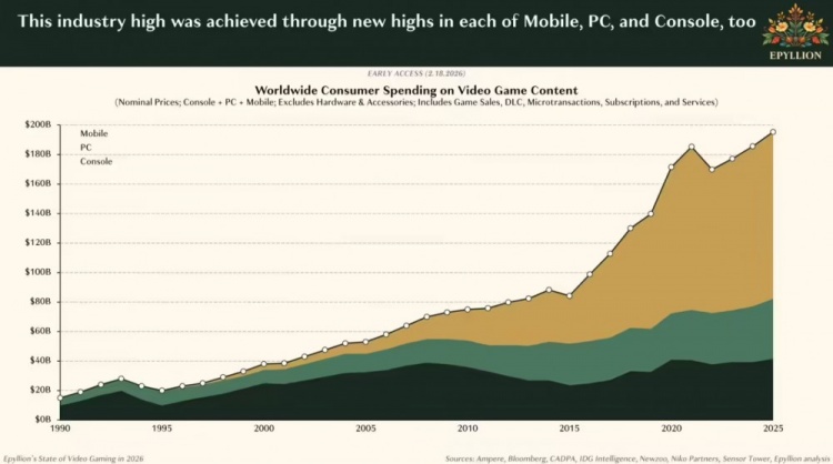 直播吧2月20日讯 Epyllion 公司的 Matthew Ball 发布《2026 年视频游戏现状报告》,称 2025 年全球游戏内容销售额达1956 亿美元(注:现汇率约合 1.35 万亿元人民币),同比增长 5.3%,不过私人投资却暴跌 55%。