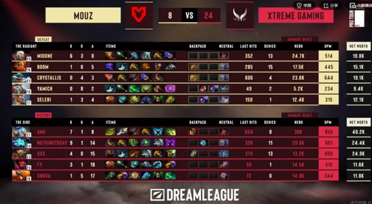 【41分钟】肉山团,XG开雾找机会,NTS蓝猫先手拉找到了Crystallis飞机!虽然MOUZ有海民雪球+马尔斯框大+老奶奶轰炮多个技能保护和反打,但是XG双大哥BKB进场,有撒旦的Ame凯直接大招吸了回来!XG追击留住飞机之后局势已定!MOUZ敲出GG!这样XG就已经确定晋级二阶段小组赛!