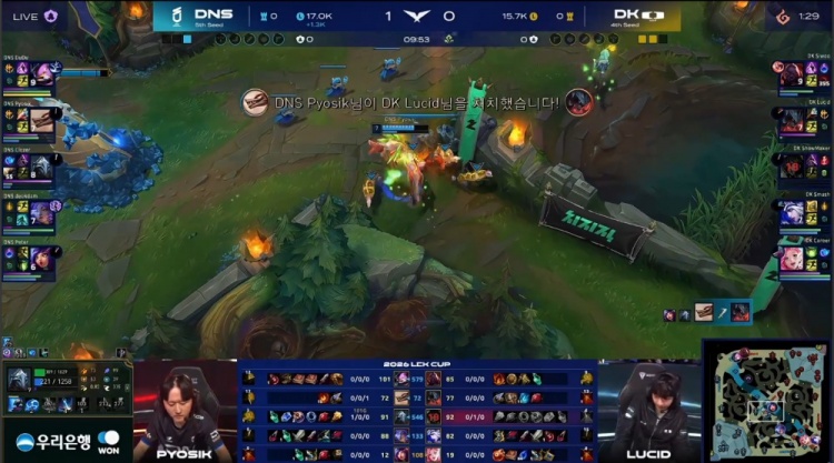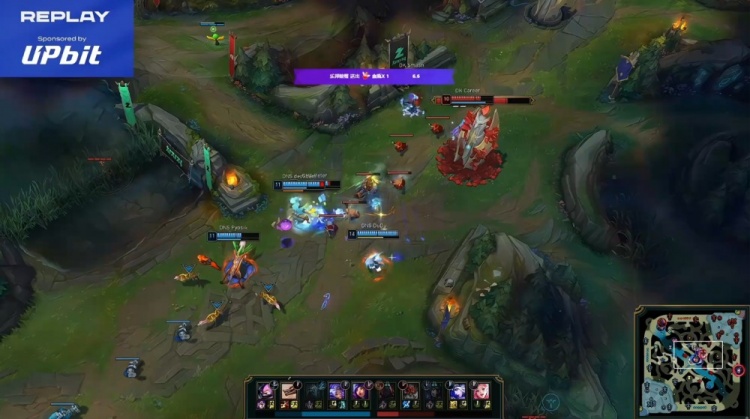 中期河道对抗Pyosik百裂冥犬锁头Lucid剑魔,DNS推进中路。紧接着小龙团Lucid剑魔击杀DuDu凯南,DK打出0换3并拿到大龙,经济反超2.6k。