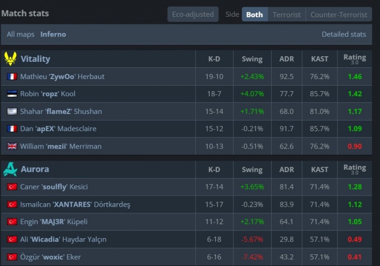 随后礼神爆轰四杀+狠人特三杀,长枪局礼神左手双人四杀,Aurora连追4分,比分来到8-11。第20回合,小蜜蜂枪械不全,狠人与soulfly开场工地被杀,Aurora难赢3v5残局送小蜜蜂赛点,随后Aurora连追3个赛点被锁10分,Zywoo大狙双杀收尾,小蜜蜂以13-10拿下图二横扫淘汰Aurora,晋级四强!