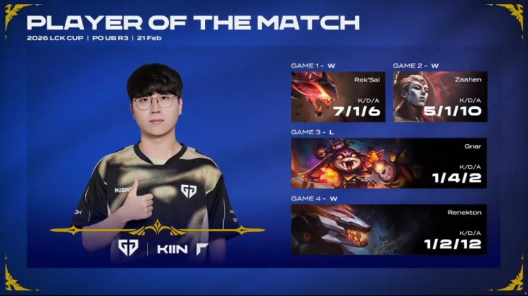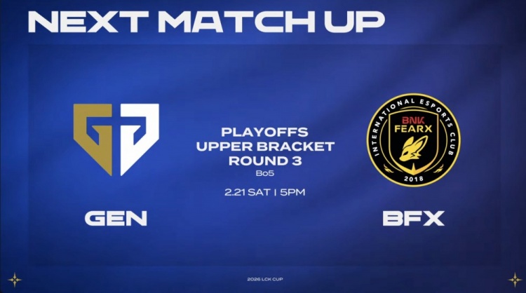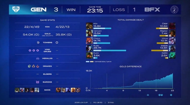 直播吧2月21日讯 2026LCK CUP季后赛继续进行,今日胜者组决赛GEN3-1战胜BFX,晋级决赛!同时也确认晋级全球先锋赛!
