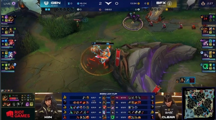 【8:53】Canyon豹女来上轻松配合Kiin鳄鱼越塔击杀Clear奥恩,GEN经济领先2k。