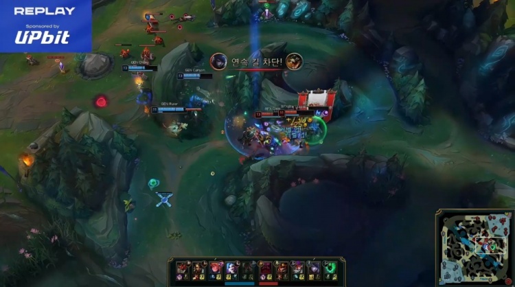 【11:56】Duro泰坦完美拉扯钩Kellin锤石将其击杀,Canyon豹女与Chovy佐伊各取双杀,GEN轻松0换5吃掉小龙,经济领先7k。