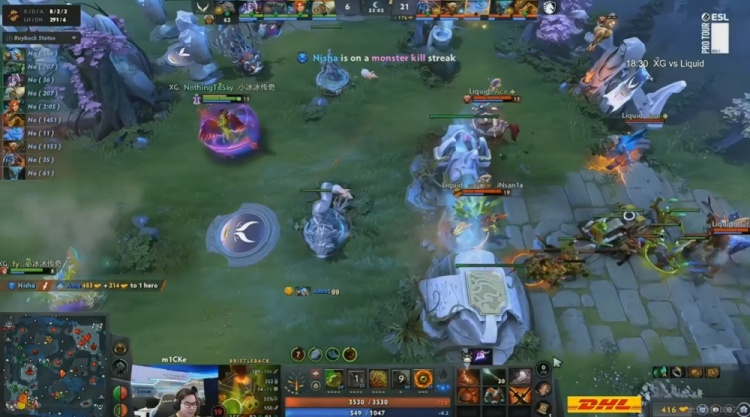 【20分钟】上路Liquid强行动手Xxs潮汐,XG支援到位潮汐交大,但是被m1CKe钢背兽直接带被动弹死了三个直接三杀!虽然NTS紫猫换掉钢背兽但是自己和Ame凯都被绕后支援的Nisha帕克收掉!最终Liquid冲上高地强杀买活的Fy风行者,这波打出1换6团灭XG!直接拉开到8K经济差了!