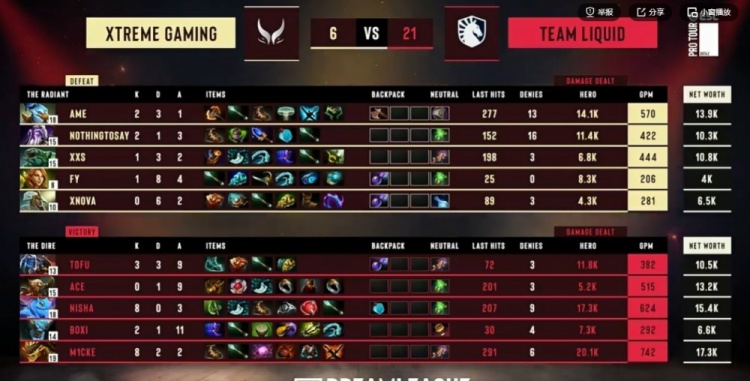 【23分钟】野区遭遇XG输出根本不够秒不掉人!反而是Xxs潮汐扛不住输出和xNova陈一起倒了!Liquid打出0换2,拆掉中二塔之后直接上高!先拆中路高地之后再转下,上路带线的Ame凯直接被Boxi白牛定位逮捕了!Ame也不拖拉直接敲出了GG!XG首战告负!