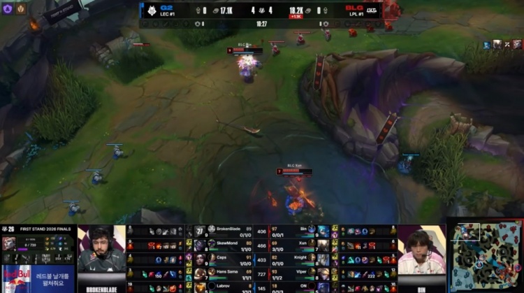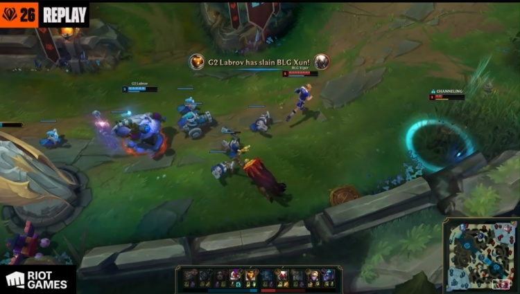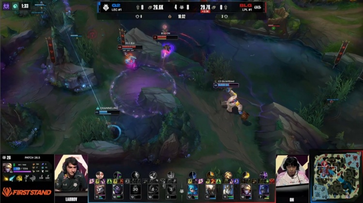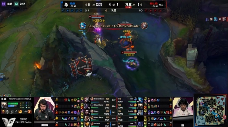 【26:08】BLG野辅继续进G2野区抓掉Labrov巴德,后者研发i4,BLG经济领先4.4k。