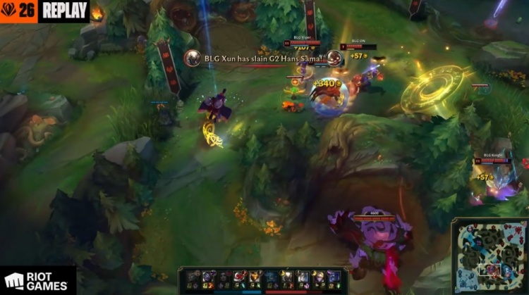 第二局前期双方中下两路互有来回,Xun潘森不断开飞支援帮助BLG打开局面。中期ON慎飞上配合Xun潘森击杀BB,G2四人被围塔下,BLG打出0换2经济领先3.4k。