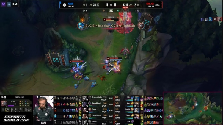 【28:41】G2下野区开战,Labrov巴德金自己起身被杀,BLG经济领先6k。