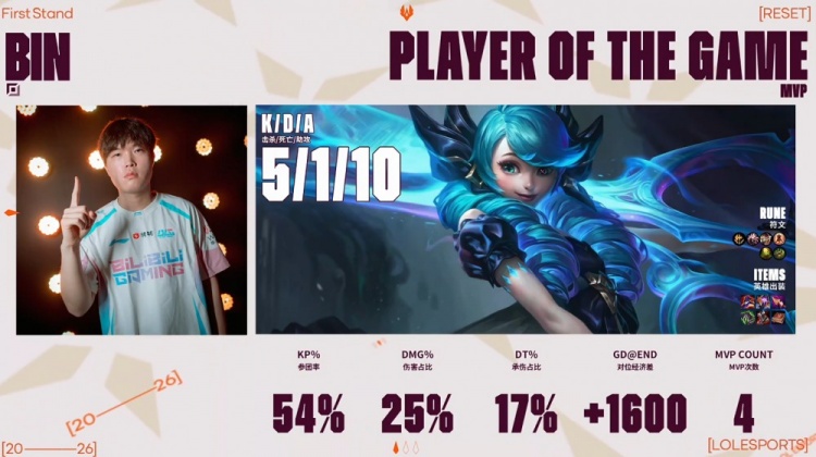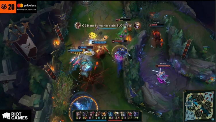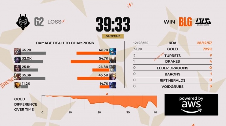 后期BLG上路推进,HansSama飞机轰掉Viper,G2打出2换4将经济劣势扳回至2.5k。最终BLG下路推进,SkewMond蒙多509层心之钢开大难顶伤害被杀,BLG冲上高地推平G2基地扳回一城。