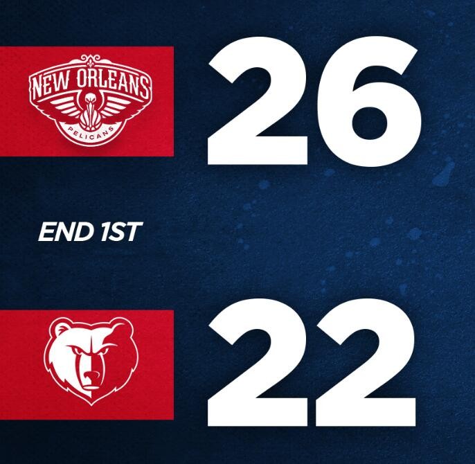 比赛开始,鹈鹕先声夺人命中三分,瓦兰丘纳斯单打得手,锡安自投自抢拿下两分,莫兰特和克拉克各抛进一球,霍勒迪追身射中三分帮助鹈鹕12-6暂时领先。克拉克放篮命中,两队多次尝试外线出手但命中率不高,霍勒迪转而连续杀入内线拿分,接着雷迪克外线支援三分,鹈鹕将领先优势扩大到两位数。莫兰特再次连线克拉克暴扣止血,英格拉姆翻身跳投命中,两队均多次出现失误,阿伦替补登场后用两记三分为灰熊吹起反击号角,英格拉姆则用罚球为鹈鹕守住领先,首节打完,鹈鹕26-22领先。
