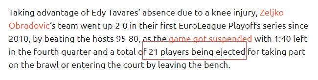 本场比赛也提前结束,双方共有21名球员因参与斗殴或离开替补席被驱逐出场。