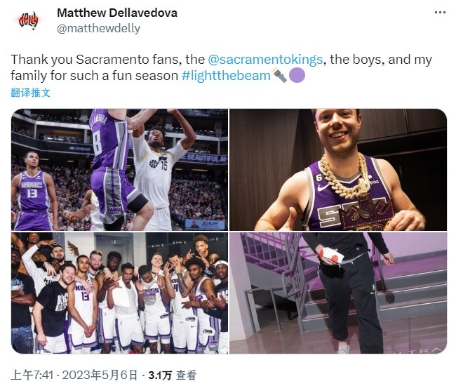 直播吧5月6日讯 今日,国王后卫德拉维多瓦发推致谢本赛季写道:“感谢萨克拉门托的球迷,感谢萨克拉门托国王队,感谢男孩们和我的家人们,让我度过了一个这么有趣的赛季#lightthebeam🔦🟣”
