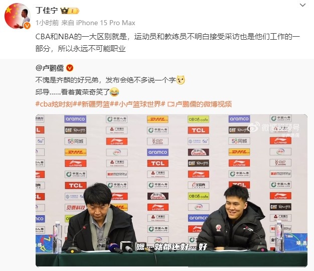 裁判专家丁佳宁转发该段采访内容并写道:“CBA和NBA的一大区别就是,运动员和教练员不明白接受采访也是他们工作的一部分,所以永远不可能职业。”