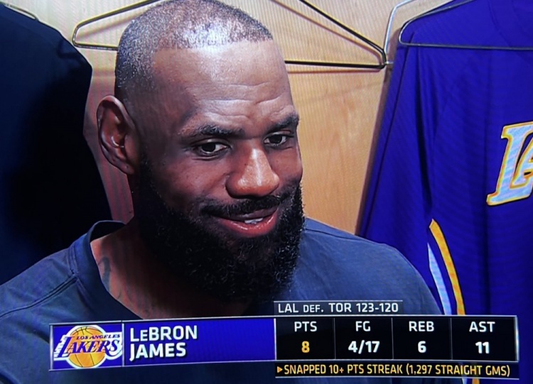 谈到自己连续得分上双纪录中断的感受,詹姆斯说:“没啥感受,我们赢了。”