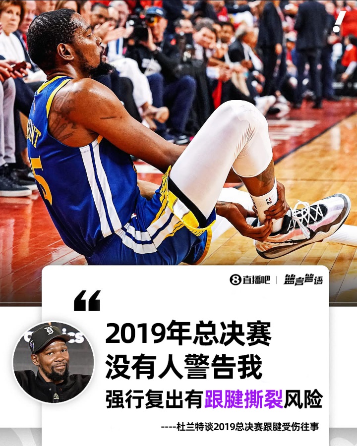KD表示他不后悔,但如果事先知道会这样,可能会做不同决定:“我不后悔出场。如果我事先知道那个信息,我可能会做出不同的决定。如果有人跟我说‘啊,你可能会撕裂跟腱’,我大概就不会上场了。当时没人真正提醒我这件事。”