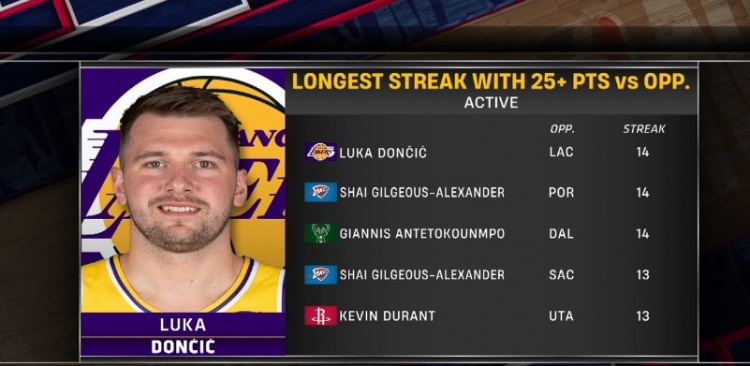 他太爱打快船了!东契奇VS快船已连续14场25+ 并列联盟现存最长