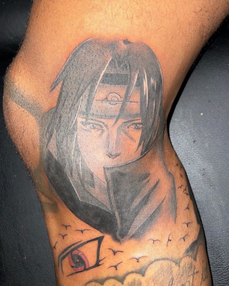 而在他的右腿膝盖内侧的位置,还有一个宇智波鼬的头像纹身。