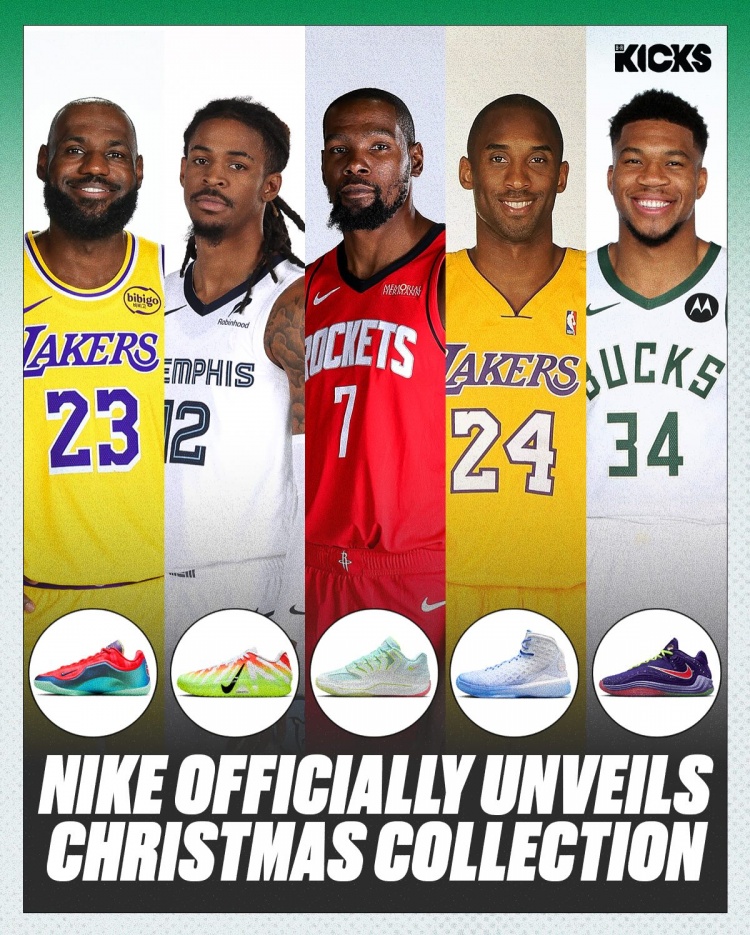 其中包括单独的詹姆斯球鞋Nike LeBron 23 “Stocking Stuffer”、科比球鞋Nike Kobe 3 “Royal Pulse”、字母哥的Freak 7 “Snow Pack”。还有以套装配色出现的“Snowed In”系列,该系列包括杜兰特的KD 18、莫兰特的Ja 3、团队鞋款GT Cut 3还有文班主力代言的GT Hustle 3。