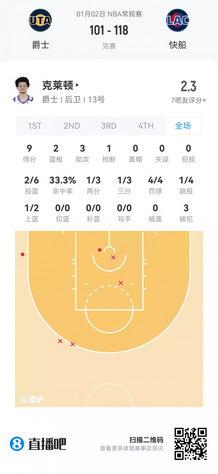 爵士首轮18号秀小沃尔特·克莱顿 登场30.2分钟