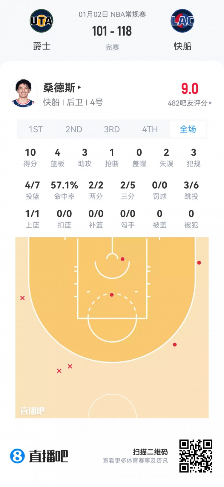 快船次轮50号秀科比·桑德斯 登场24.5分钟