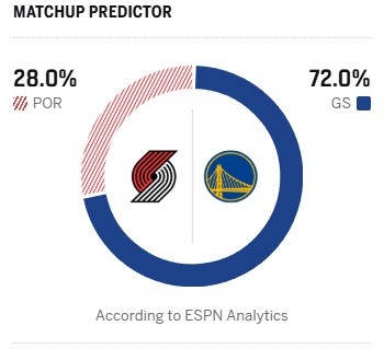 今日ESPN给出本场获胜概率预测,勇士高达72%,开拓者只有28%。