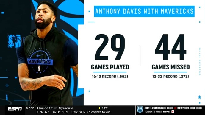 浓眉加盟独行侠后仅出战29场战绩16胜13负 缺席44场期间12胜32负