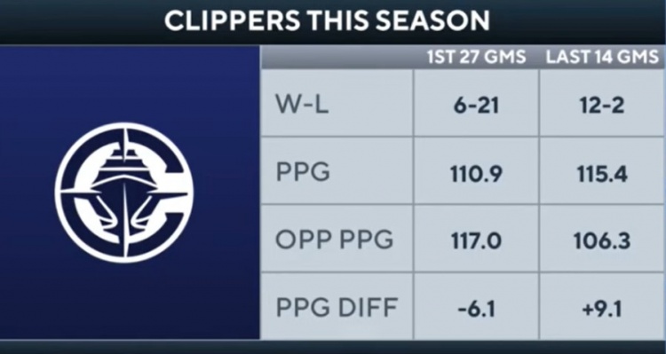 >判若两队!快船前27场6-21场均净负6.1分 近14场12-2场均净胜9.1