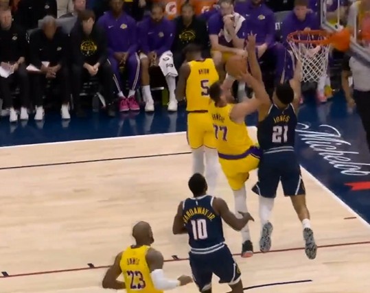 >詹东连线!詹姆斯反击助攻东契奇跟进对抗上篮2+1!高难度!