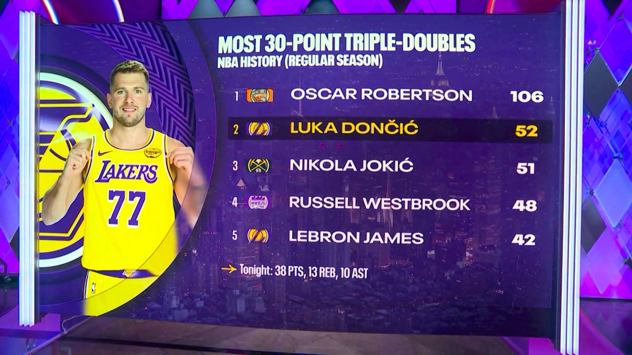 东契奇生涯第52次单场30+三双 超越约基奇位列NBA历史第二