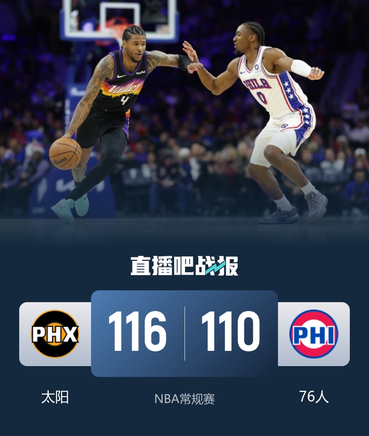 比赛开始,76人率先发力打出8-2的开局,乌布雷外线开炮连续三分命中,太阳轮番冲击内线频频得手奋力追赶,杰伦·格林替补登场连投带罚拿分,次节76人命中率下降,太阳4记三分强势反超,乌布雷三分还有,太阳内外开花稳住局势,半场战罢太阳57-53领先76人。易边再战,太阳火力全开,单节飙中8记三分轰下40分,一举将分差拉开到两位数以上,末节76人打出9-0的攻击波迫近比分,狄龙两罚全中稳住局势,最终,太阳116-110击败76人,升至西部第6。