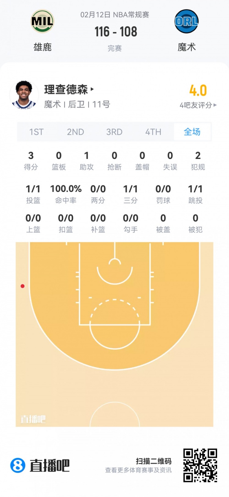 魔术首轮25号秀小杰斯·理查德森 登场6.9分钟