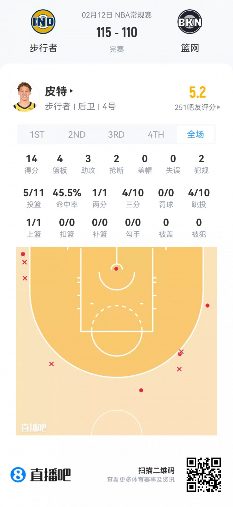 步行者次轮54号秀泰伦·皮特 登场26.7分钟