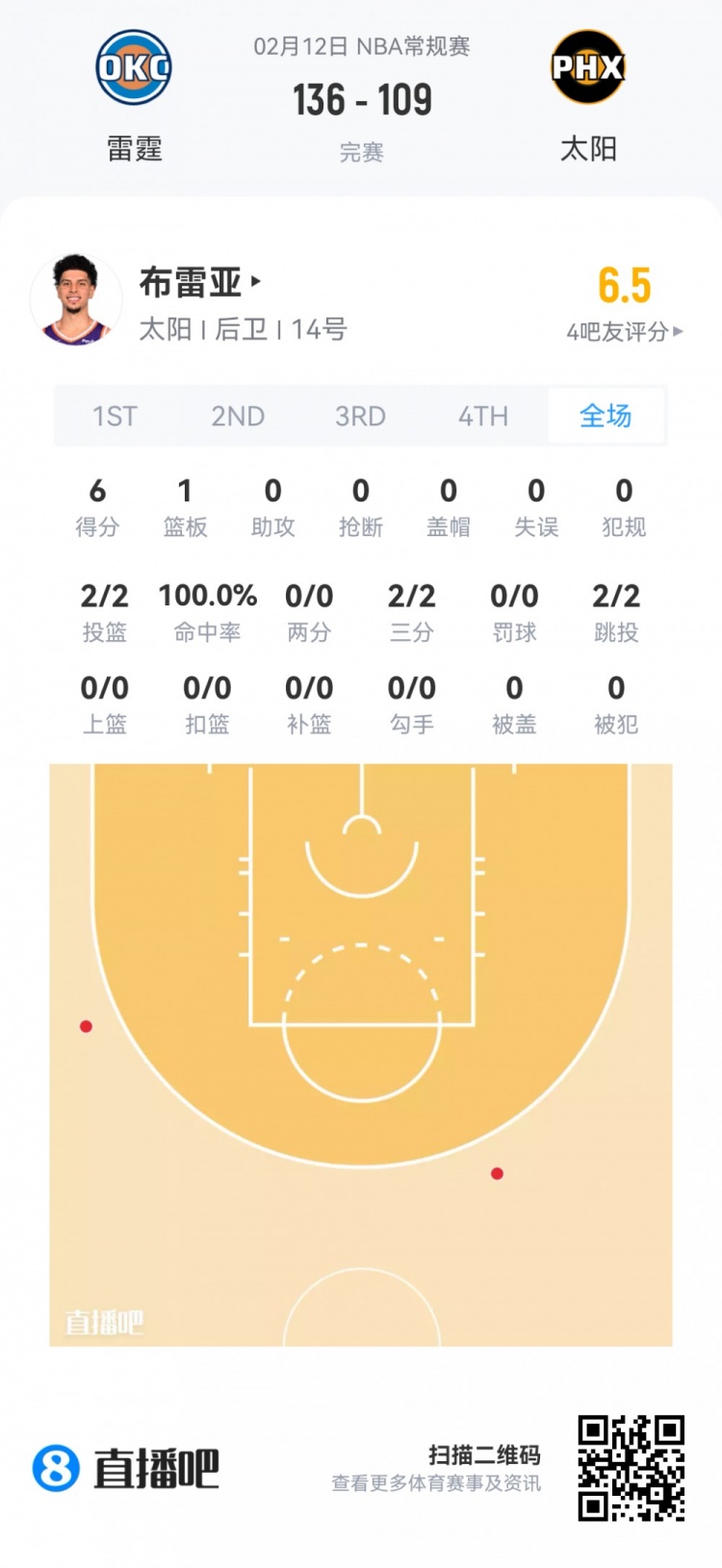 太阳次轮41号秀科比·布雷亚 登场7.8分钟