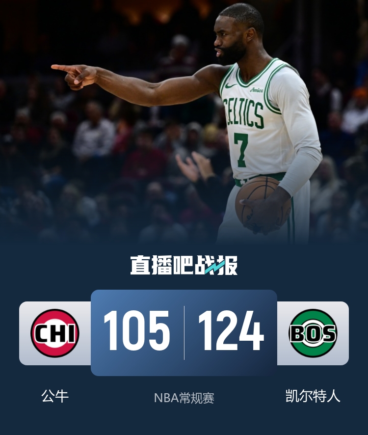 开场后两队进入状态都比较早,你来我往也是交替领先,首节尾声普理查德和武切维奇联手打出一波9-0的攻势为凯尔特人建立领先。第二节上来凯尔特人延续攻势将分差拉大到20分以上,公牛进攻端始终未能找到状态,第二节凯尔特人全面开花单节净胜19分,半场过后凯尔特人领先28分。易边再战,凯尔特人命中率下降,公牛虽然找到一些状态但也无法掀起有效的反扑,凯尔特人始终保持巨大的领先优势。最后一节凯尔特人依旧占据场面优势,两队都撤下主力,公牛虽然追回一些分数但对比赛结果没有影响,最终凯尔特人124-105送给公牛6连败。